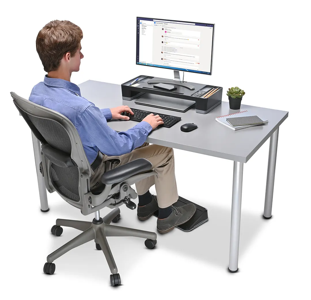 Con su diseño compacto y ajustes de inclinación ajustables, el apoya piés que ahorra espacio se adapta a espacios de trabajo más pequeños sin comprometer la comodidad. Seleccione un ángulo de 12 o 18 grados para obtener un soporte ergonómico mejorado en su escritorio.