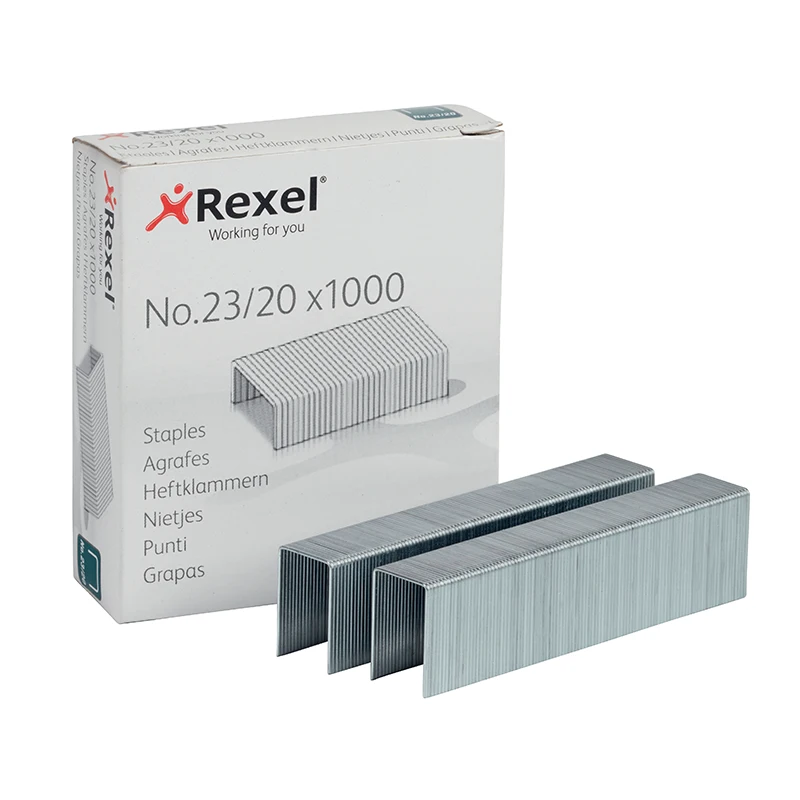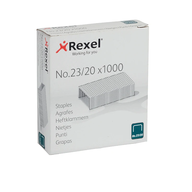 Confíe en la alta capacidad y durabilidad de los corchetes de uso pesado Rexel. Corchete de alambre acerado Nº 23/20 mm de Rexel® ofrece un óptimo resultado de forma fácil y segura.