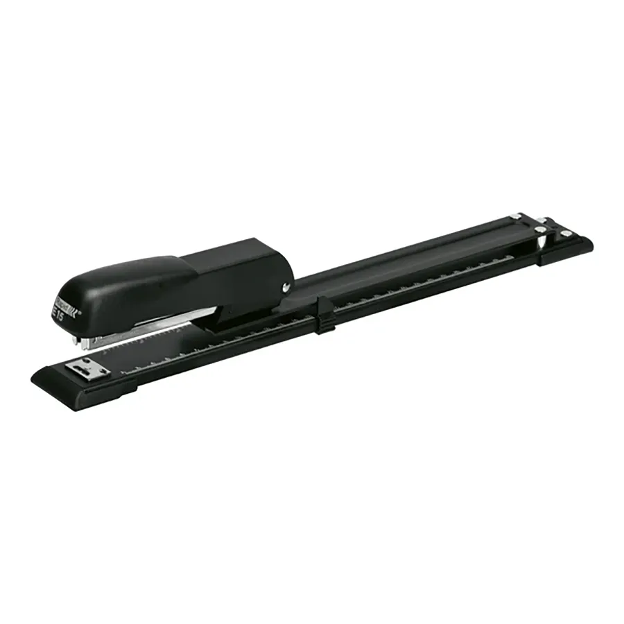 Corchetera de largo alcance con función de corcheteado central. Modo de clavado. Ideal para servicios postales, imprentas y agencias de publicidad.