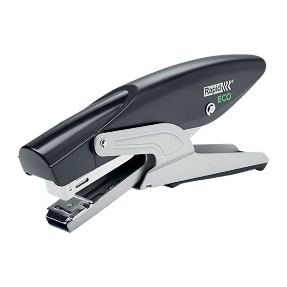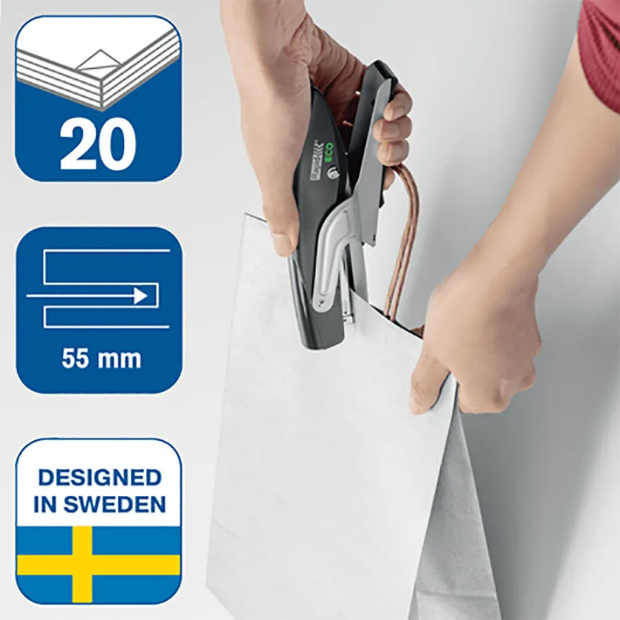 Corchetera de tenaza eco-friendly para mantenerte organizado a la vez que ayudas a proteger el medio ambiente. Esta corchetera esta fabricada con un 81% de plástico reciclado postconsumo y tiene un embalaje de cartón 100% reciclado sin plástico con impresión ecológica a base de soja. Con una gran profundidad de inserción y un yunque ajustable, pueden utilizarse para el corcheteado permanente y temporal de documentos, folletos y sobres. Diseñada para corchetear hasta 20 hojas de papel, esta corchetera de tenaza 100% reciclables son ideales para todas tus tareas cotidianas.