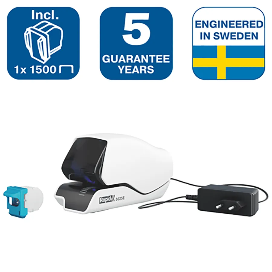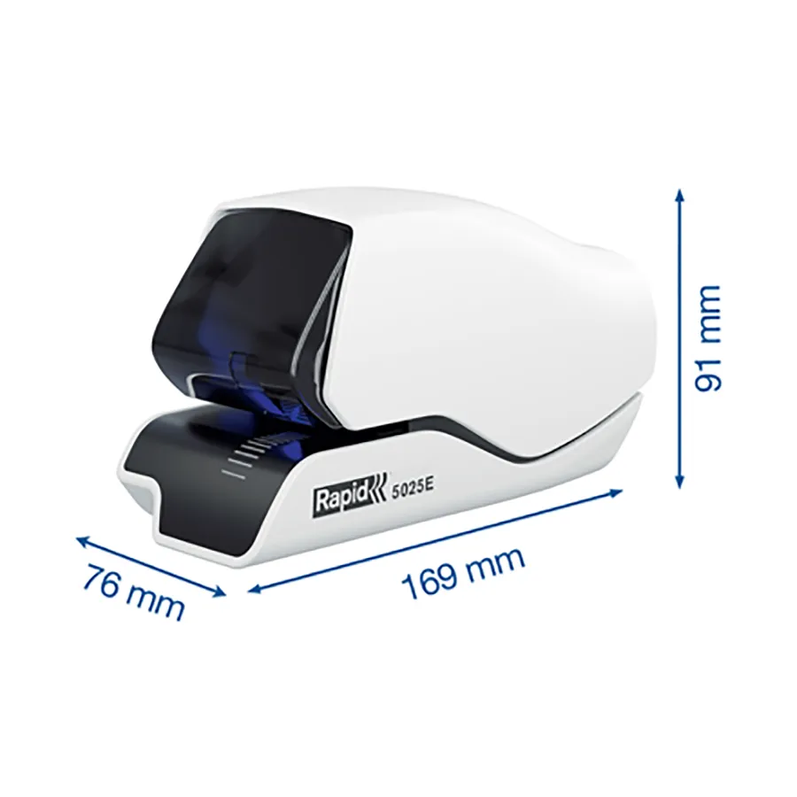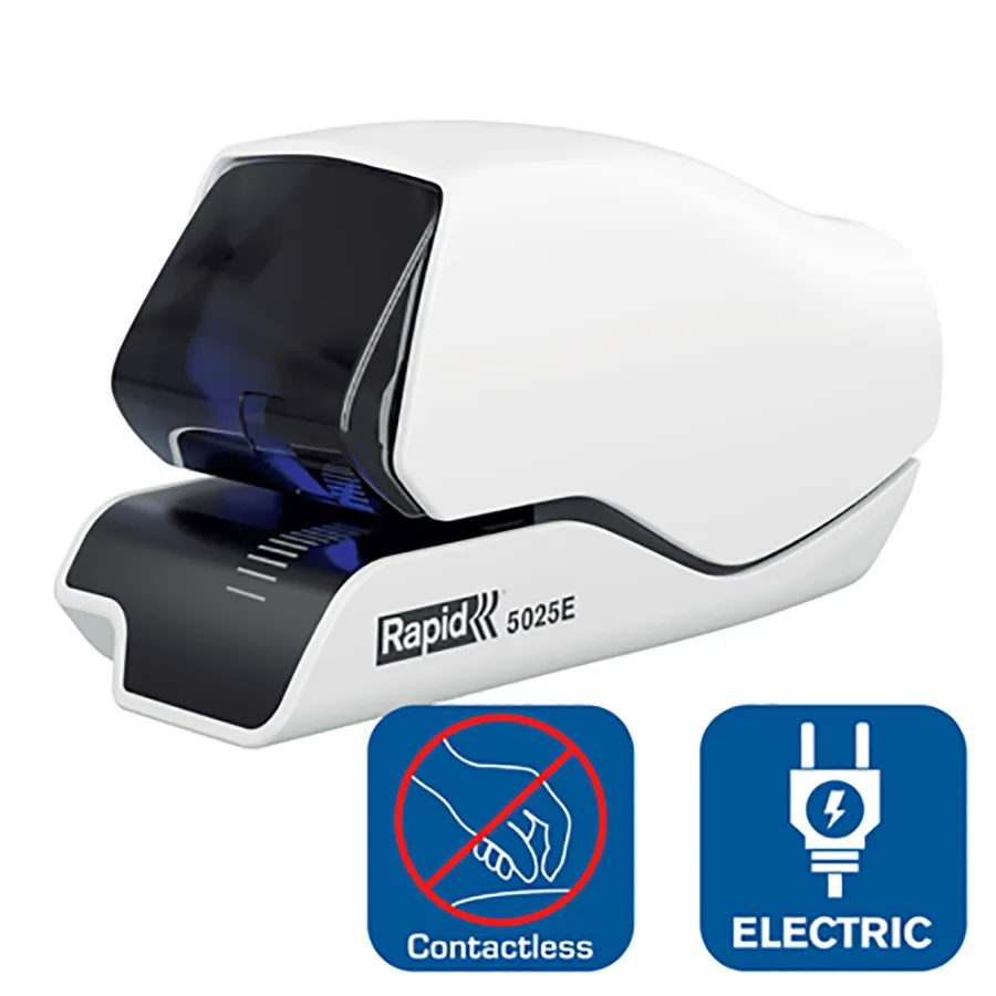 La Rapid 5025E corchetea sin esfuerzo hasta 25 hojas de papel a la vez (80 g/m²). Diseñada para entornos de grapado de alta frecuencia, como oficinas, recepciones de hoteles y mostradores de caja, esta coechetera eléctrica garantiza un rendimiento confiable y sin esfuerzo. Para mejorar la precisión y la eficiencia, el 5025E cuenta con un sistema de guía LED que indica con precisión dónde se colocará cada corchete. Disfruta de un resultado impecable con su funcionamiento sin contacto. Se alimenta mediante un adaptador de red (incluído) y viene con 1 cartucho (1500 corchetes). Color blanco.