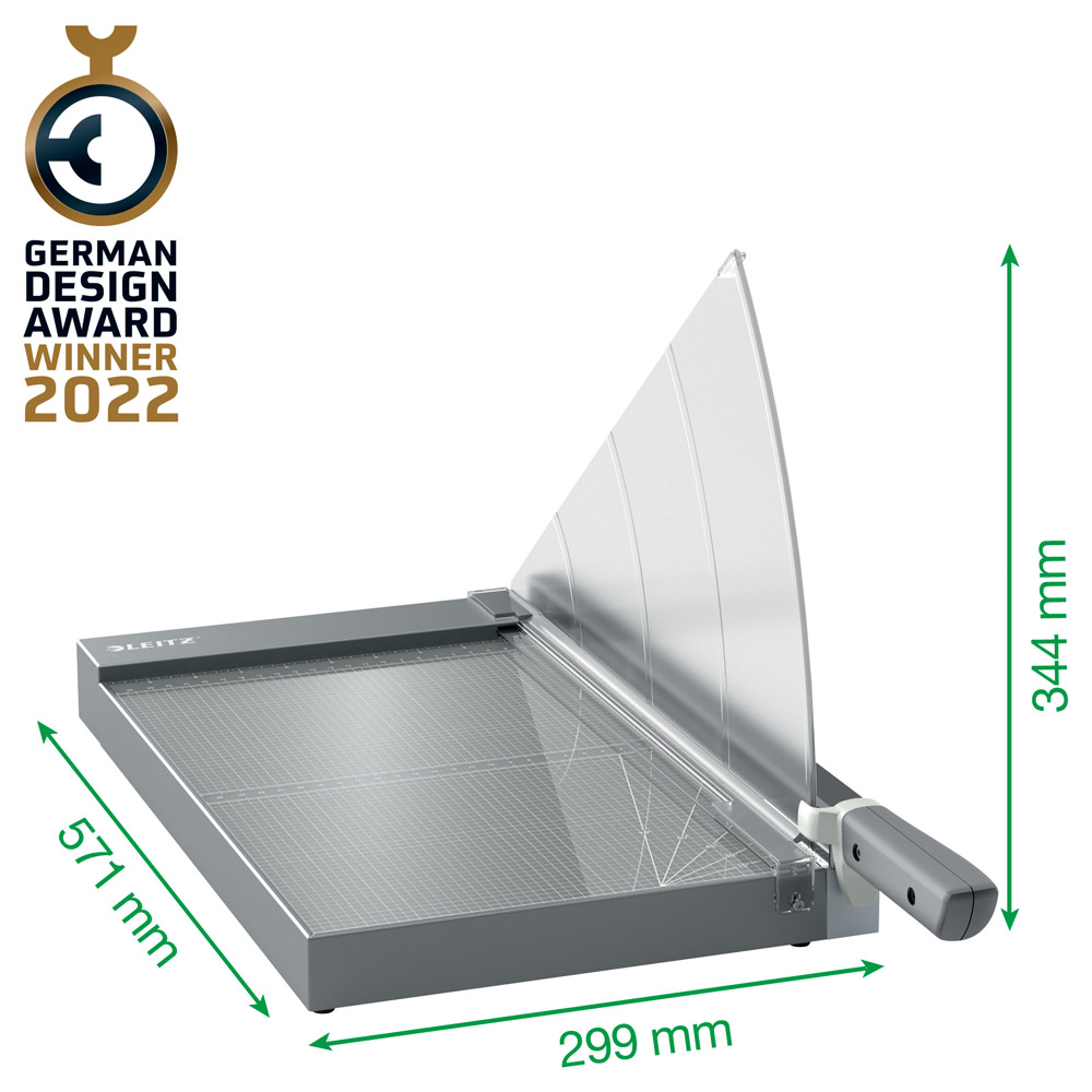 La Guillotina 1525G de palanca para papel Leitz Precision Office Pro A4+ es perfecta para el uso general en la oficina para cortar papel, etiquetas, películas, fotos, hojas plastificadas, tarjetas y cartón de montaje.