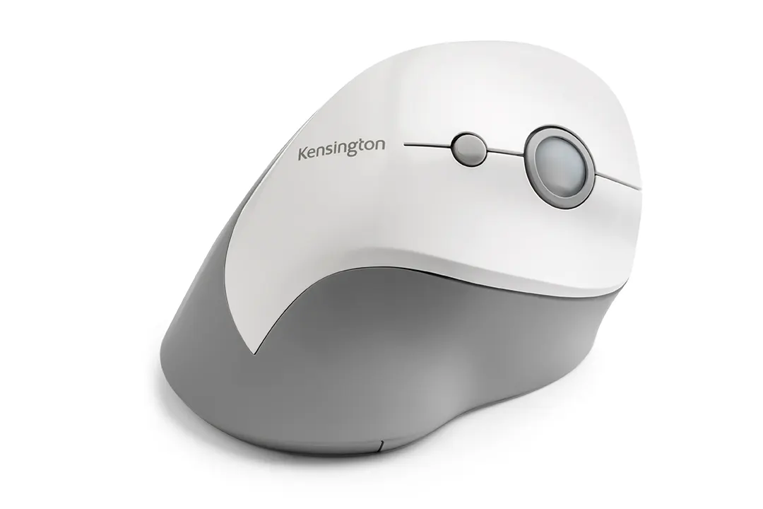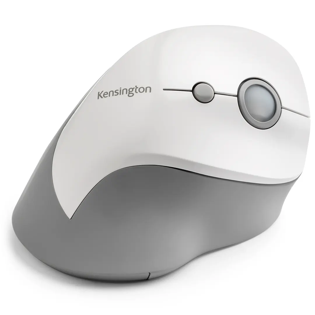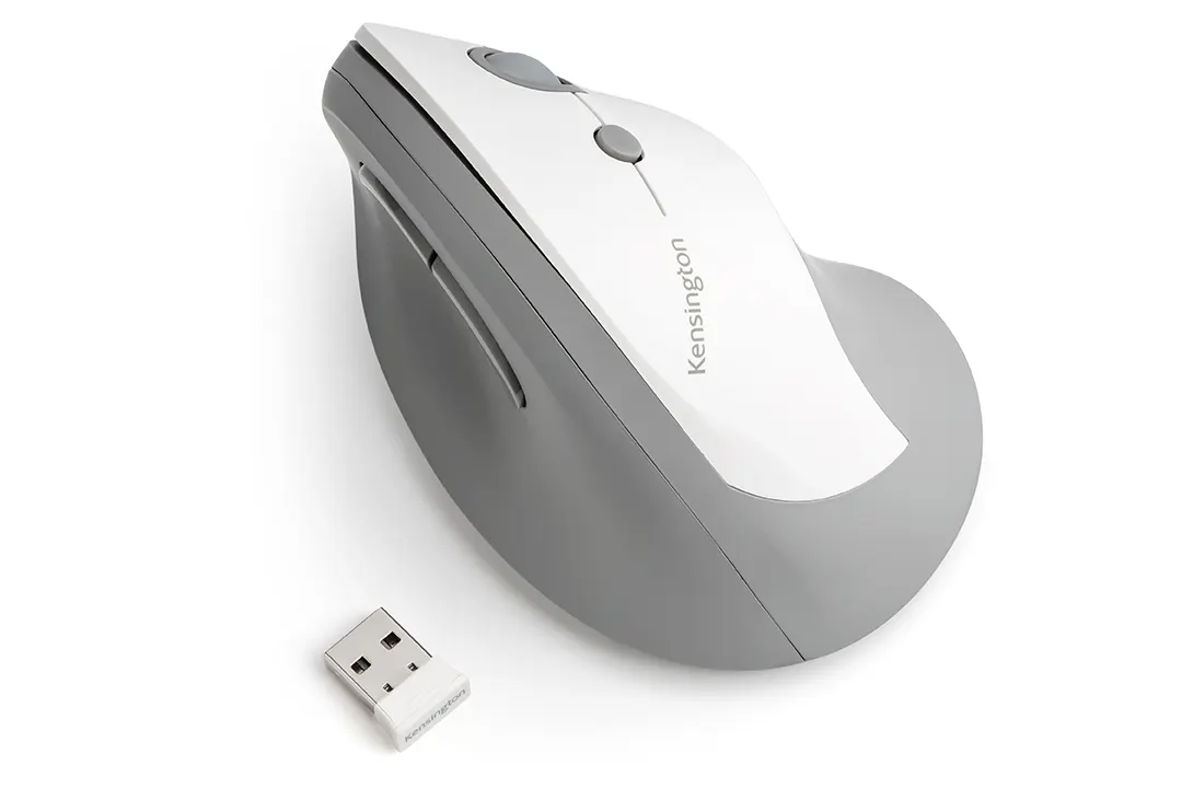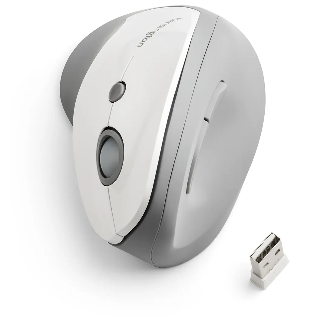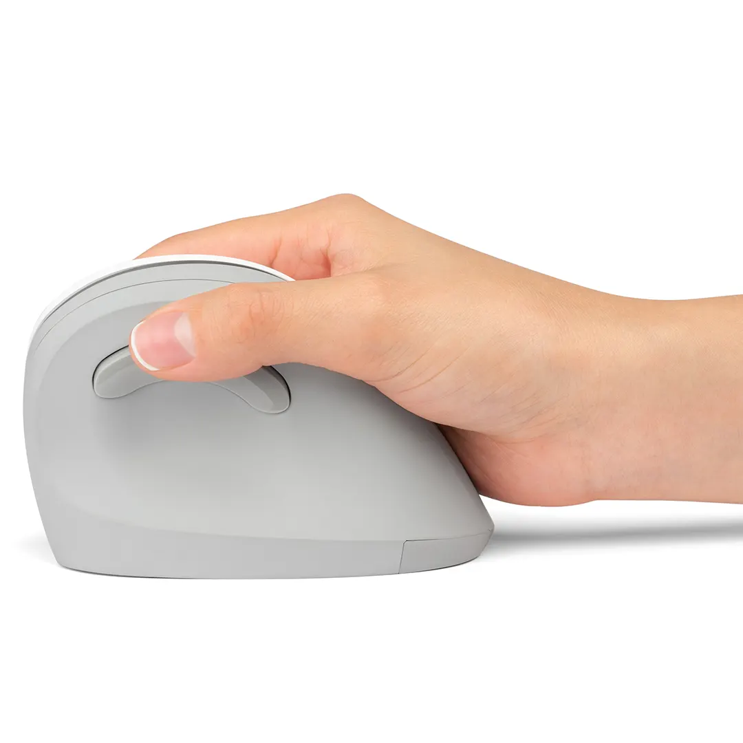 El mouse inalámbrico vertical Pro Fit® Ergo, con su posición natural de apretón de manos, mejora la postura de la muñeca para mayor comodidad.