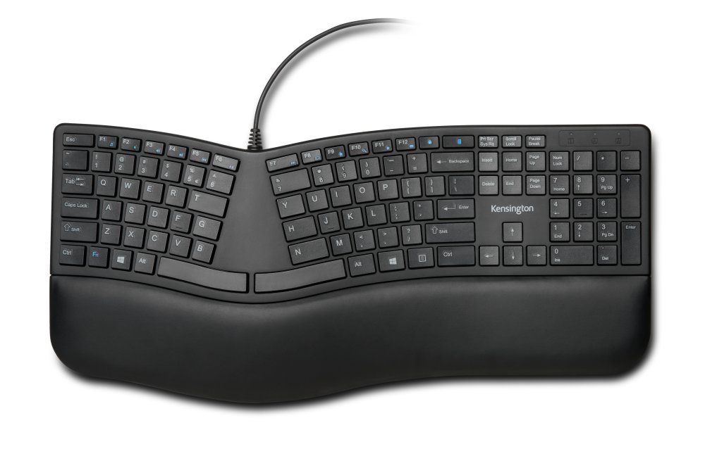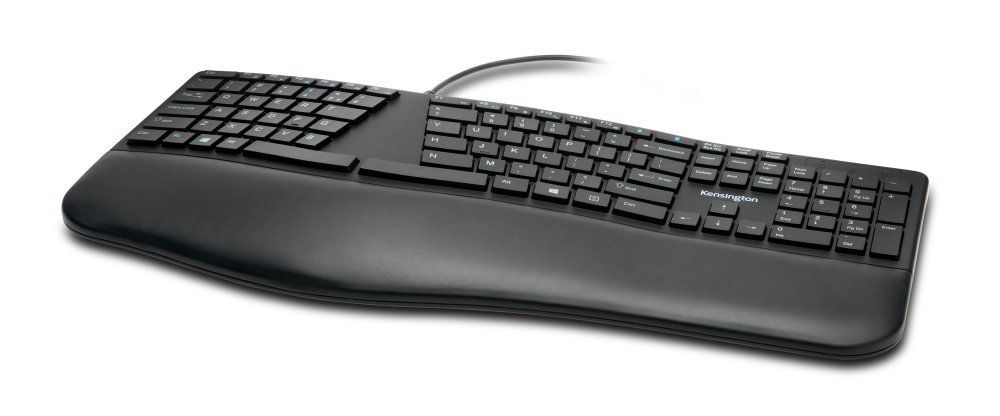 • Teclado dividido e inclinado con inclinación inversa ajustable: mantiene las manos, las muñecas y los antebrazos en una posición cómoda y con alineación neutral.