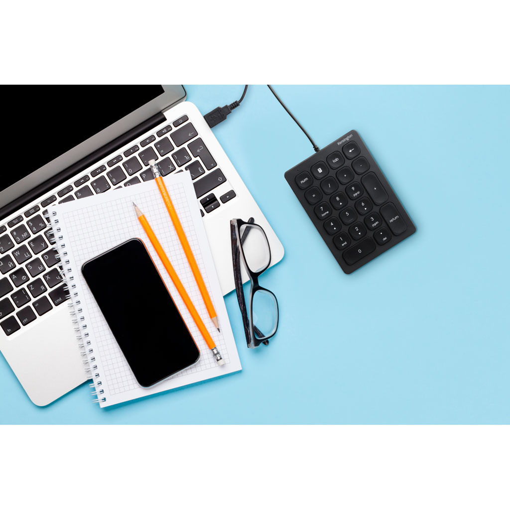 A medida que cada vez más personas trabajan y aprenden desde casa, muchos ordenadores portátiles y teclados compactos carecen de teclado numérico. El teclado numérico con cable, un complemento perfecto para nuestro teclado compacto multidispositivo con tecnología inalámbrica dual (K75502), permite a los usuarios de Windows, Mac y Chrome OS introducir datos numéricos de forma rápida y sencilla.