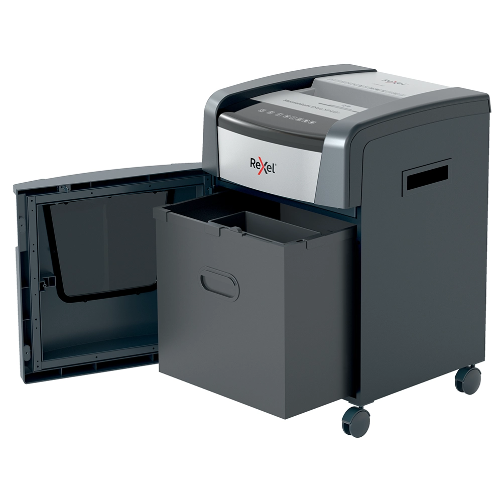 La destructora XP418+ destruye hasta 18 hojas de papel A4 (80 grs) de una sola vez a través de la ranura de alimentación manual en partÃculas P-4 (4x35mm). Esta destructora de corte en partÃculas está diseñada para un uso moderado o intenso gracias a su gran capacidad de hojas, su gran papelera de 45 litros y su tiempo de funcionamiento continuo. No es necesario quitar primero las grapas y los clips; esta destructora de Rexel también destruye de forma segura CD, DVD y tarjetas de crédito a través de una ranura de alimentación independiente.